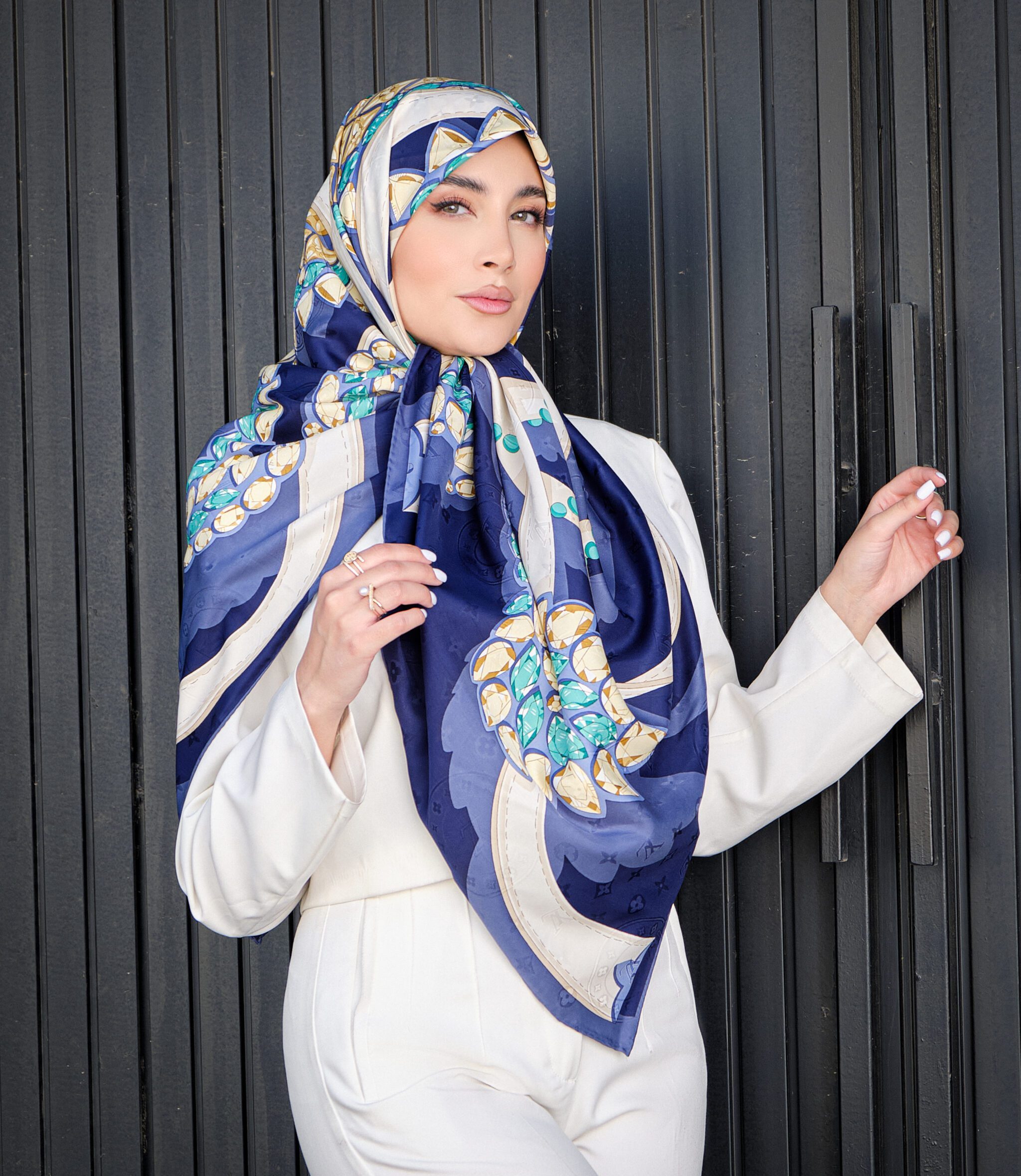 ابعاد این روسری ۱۴۰ در ۱۴۰ سانتی‌متر است.