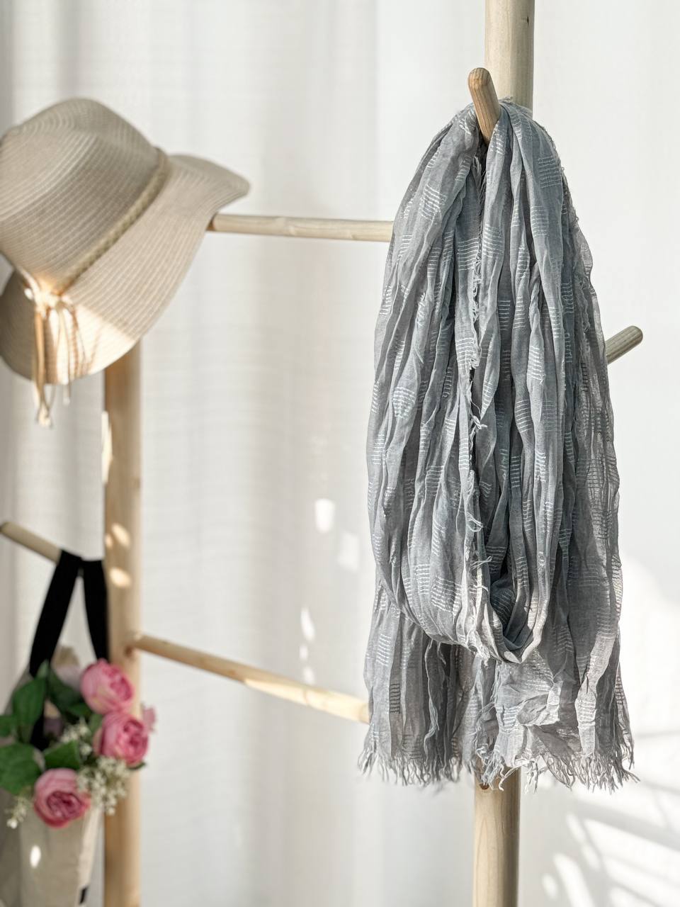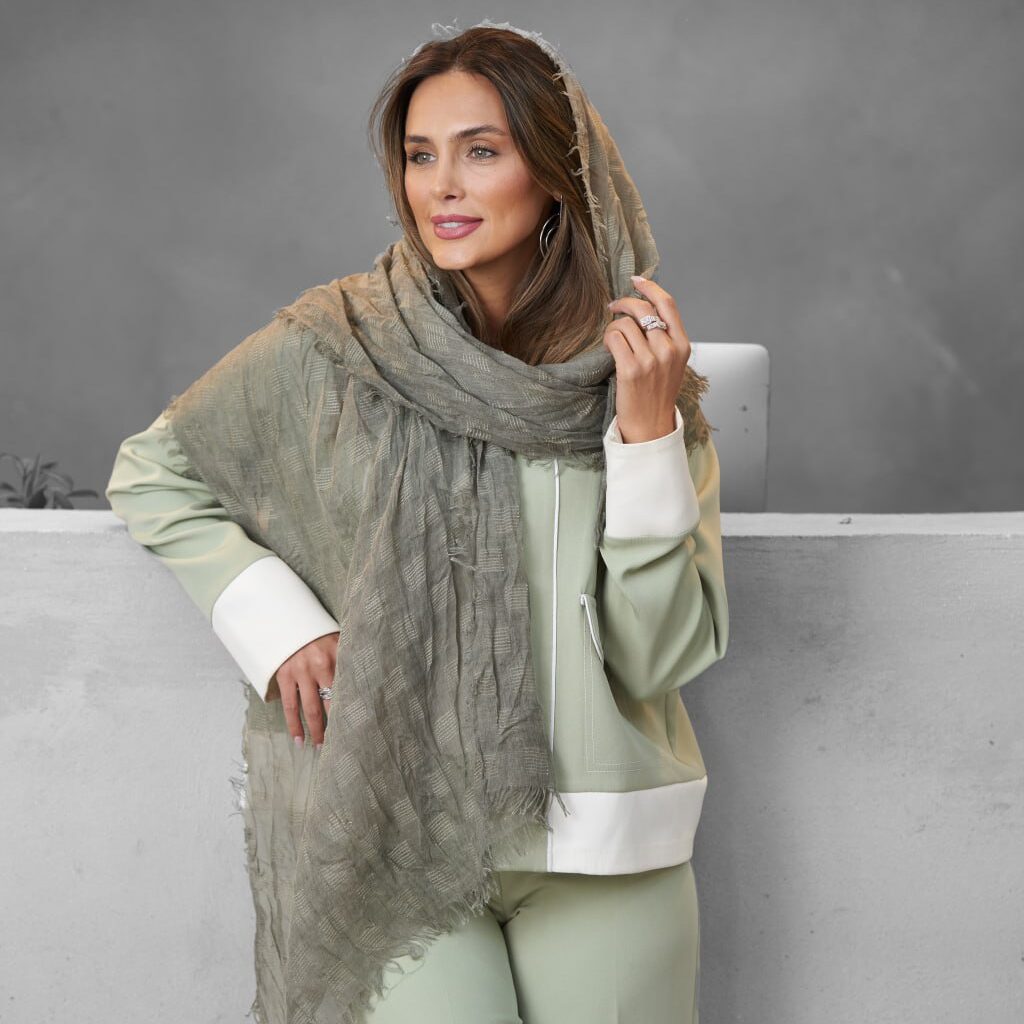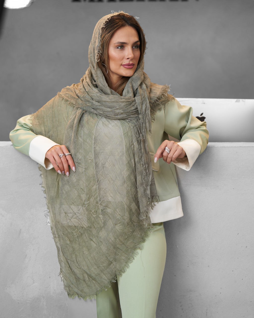 این شال نخی، دورریش و دارای خط‌های ریزی است که طرح مربع بوجود آوردند.
